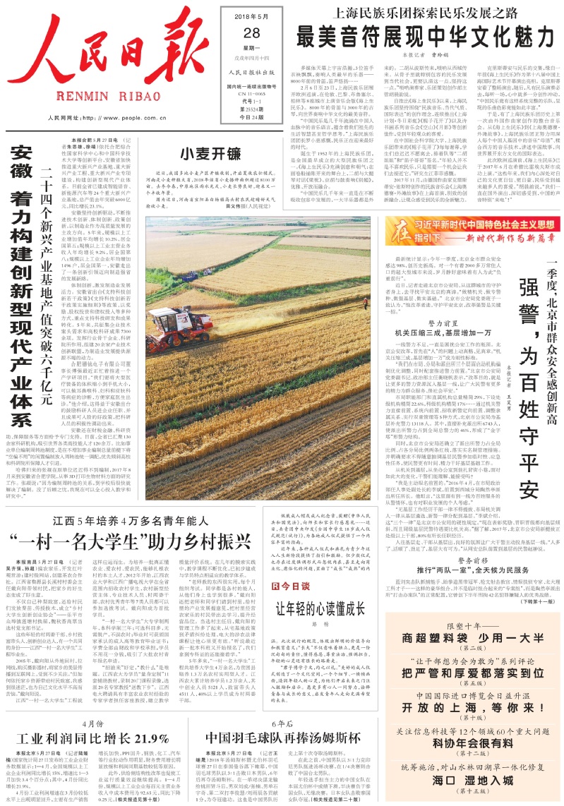 《人民日报》(2018年05月28日 01版)刊载《江西5年培养4万名青年能人“一村一名大学生”助力乡村振兴》,报道了“一村一名大学生”工程取得的卓越成果。