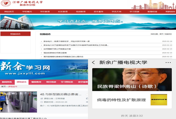 疫情防控期间,为落实习近平总书记关于“同舟共济,科学防治精准施策”打赢疫情防控阻击战的相关要求,学校发挥网络教育线上学习的优势,积极行动起来,做好面向当地社区居民、广大教职工和成教学员的疫情宣教、疫情防控工作。主动与国家数字化学习资源中心对接、沟通,相继在新余学习网、新余广播电视大学官网、新余广播电视大学微信公众号等学习平台免费开通了“新型冠状病毒防控公益课程”,包括60余个微课程余个微课程和1门《新型冠状病毒防控教程》慕课。内容涵盖认识新型冠状病毒、个人防护群体公众及医务人员心理辅导与干预谣言辨析等疫情防控的关键方面,供全市社会大众在线学习、传播科学防控知识,以便市民更多了解防控新型冠状病毒感染肺炎相关知识,搭建起全民科学防疫“心”桥梁,用知识的力量抗击疫情,做到防控宣传教育全覆盖。(撰稿人:新余电大张群、赖文华 责任编辑:罗楚颖)