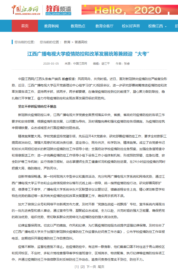 编者按:当前,全国新型冠状病毒感染肺炎疫情形势依然严峻复杂,防控正处在最吃劲的关键阶段,江西广播电视大学严格贯彻落实上级有关要求,结合学校实际情况,统筹推进疫情防控和改革发展各项工作,努力为广大师生营造和谐稳定的校园环境。我校系列有力防控举措引发了各界媒体的广泛关注,3月5日,中国江西网刊载文章《江西广播电视大学疫情防控和改革发展统筹兼顾迎“大考”》,全文如下: