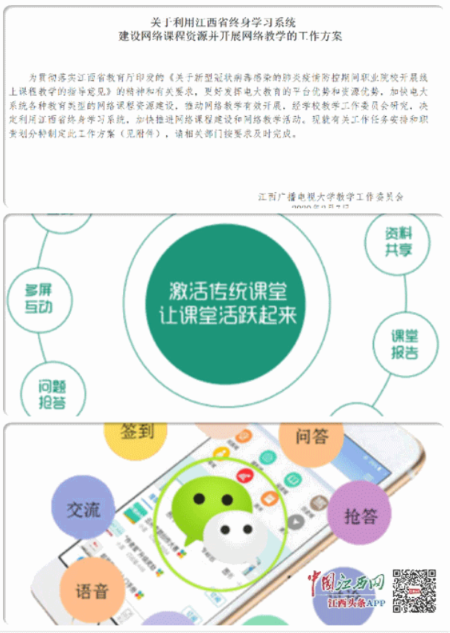 (图2:出台文件打造叫得响的特色资源品牌) 打造叫得响的特色资源品牌。出台《关于利用江西省终身学习系统建设网络课程资源并开展网络教学的工作方案》,在利用当前平台和资源满足全省各市电大、县教学点学生学习需要的前提下,重点在海量和优质上下功夫,整合和引进海量的优质学习资源,以高标准、高水平、高质量下大力气建设一批特色、优质的学习资源,让学习者愿意打开、学得下去。 持续强化系统优势。“要跳出系统思考系统建设,增强系统凝聚力”。关于彰显系统优势,学校党委从三个方面确立了建设发展的目标、思路和重点,一是由注重管理向管理与服务并重转变,由注重做强省校向做强省校与做强系统并重转变,转变管理方式,提升服务质量,加强感情联络。二是利用办学项目这个最好的“粘合剂”,积极开拓能让全省电大一起做的教育项目。三是在专业建设、资源建设、科研团队方面,吸引全省电大教师积极参与,吸收进来、凝聚起来共同建设、共同提高。 抗疫情、促发展,江西广播电视大学将继续一鼓作气,积小胜为大胜,更加注重抓细节、抓具体,推动各项工作抓准抓实抓成,为夺取疫情防控和学校改革发展“双胜利”交一份满意答卷。(责任编辑:罗楚颖) |