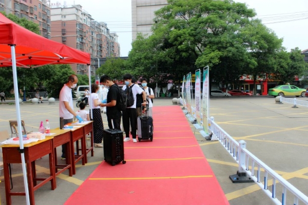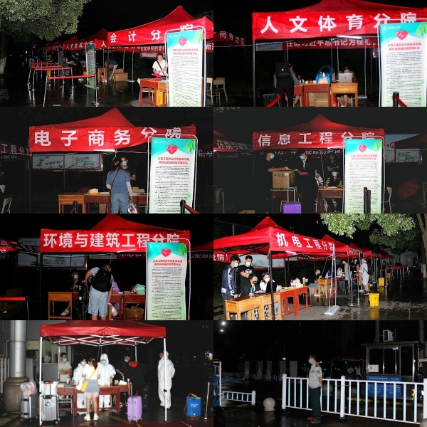 为迎接符合返校条件同学“回家”,高职学院领导班子、党员教师、非党员教师、辅导员等教职员工深入一线,工作时间从早上7点30到晚上8点,在汽车站、火车站、校门进口、食堂进口、宿舍进出口、浴室进出口等地,轮岗给同学们测量体温,保证每天进行数据报送、更新,有些老师病倒了却仍然坚守在一线岗位。即使白天烈日炎炎,傍晚大雨倾盆,各个部门教职员工始终坚守岗位,为生服务。