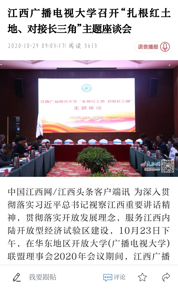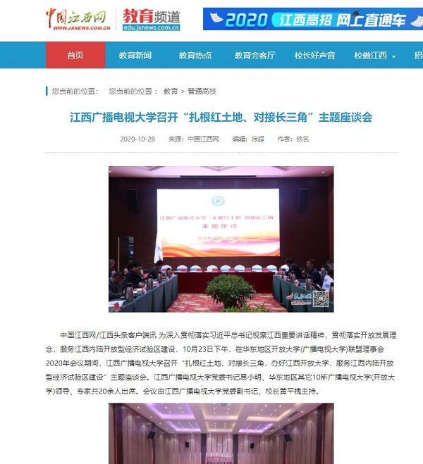 10月23日下午,在华东地区开放大学(广播电视大学)联盟理事会2020年会议期间,江西广播电视大学召开“扎根红土地,对接长三角,办好开云在线登录入口(China)官方网站,服务江西内陆开放型经济试验区建设”主题座谈会。近期,中国江西网、江西新闻客户端先后刊载文章《江西广播电视大学召开“扎根红土地、对接长三角”主题座谈会》。