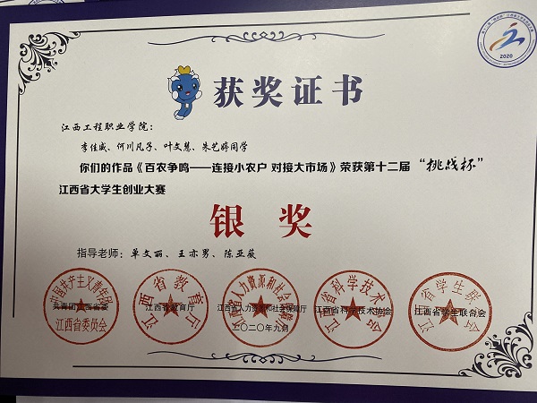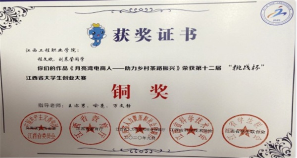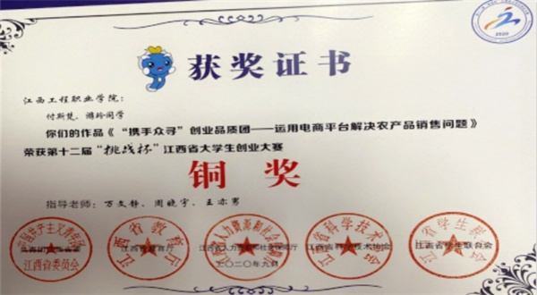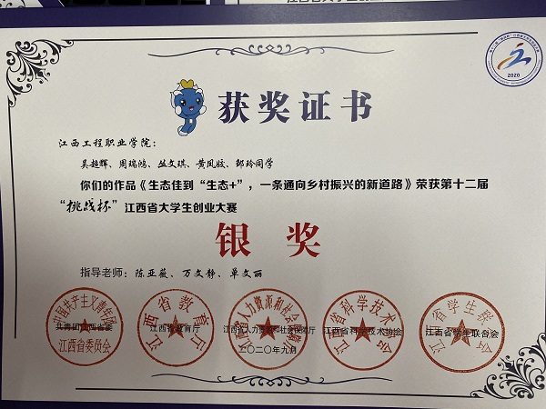 由团省委、省教育厅、省人社厅、省科协、省学联主办的第十二届“挑战杯”江西省大学生创业大赛在南昌大学落下帷幕。经过资格审查、省级复赛、视频公开答辩和组委会、评委会综合审定等环节角逐,江西广播电视大学高职学院选送的4个创业项目荣获2项银奖,2项铜奖。其中,“生态佳”、百农争鸣两个项目获得银奖,携手众寻、月亮湾电商人获得铜奖,创造了参加该项赛事以来的最佳成绩。