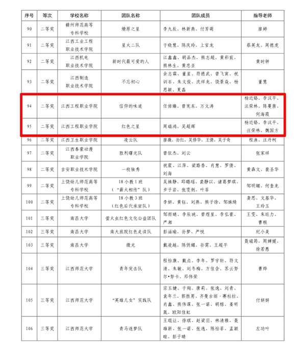 1119日,江西省教育厅公布了全省高校“红色走读”竞赛活动获奖团队名单,由我校高职学院杨近铬、李汉平、汪荣林、陈蔓茜、何海霞老师指导的“信仰的味道”团队和杨近铬、李汉平、汪荣林、魏国方老师指导的“红色之星”团队荣获二等奖。