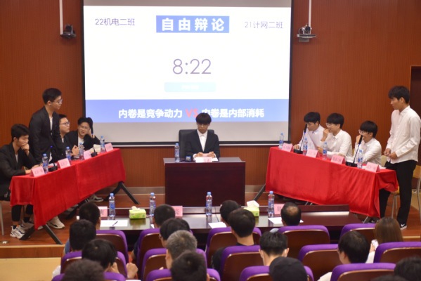 本届辩论赛以学生关注的热点问题为辩题,在近一个月的时间里,经过初赛、复赛和半决赛的激烈争夺,21级计网2班代表队和22级机电2班代表队脱颖而出,挺进总决赛。在总决赛的辩论场上,两支队伍气势如虹,围绕“内卷是竞争动力还是内部消耗”的辩题展开辩论。比赛首先进行的是立论环节,双方辩手引经据典,结合理论与实例发表自己的观点。辩手们出色的口才,敏捷的思维,幽默的语言赢得场下观众的阵阵掌声。在比赛的总结陈词环节,正反方辩手以清晰的思路和巧妙的总结为比赛完美收官。最后,现场评委从辩手们的态度、技巧、团队合作等方面进行了中肯的点评。