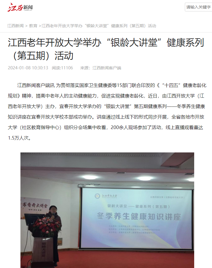 为贯彻落实国家卫生健康委等15部门联合印发的《“十四五”健康老龄化规划》精神,提高中老年人的主动健康能力,促进实现健康老龄化,近日,由开云在线登录入口(China)官方网站(江西老年开放大学)主办,宜春开放大学承办的“银龄大讲堂”第五期健康系列——冬季养生健康知识讲座在宜春开放大学校本部成功举办。讲座通过线上线下的形式同步开展,全省各地市开放大学(社区教育指导中心)组织分会场集中收看,200余人现场参加了活动,线上直播观看量达1.5万人次。