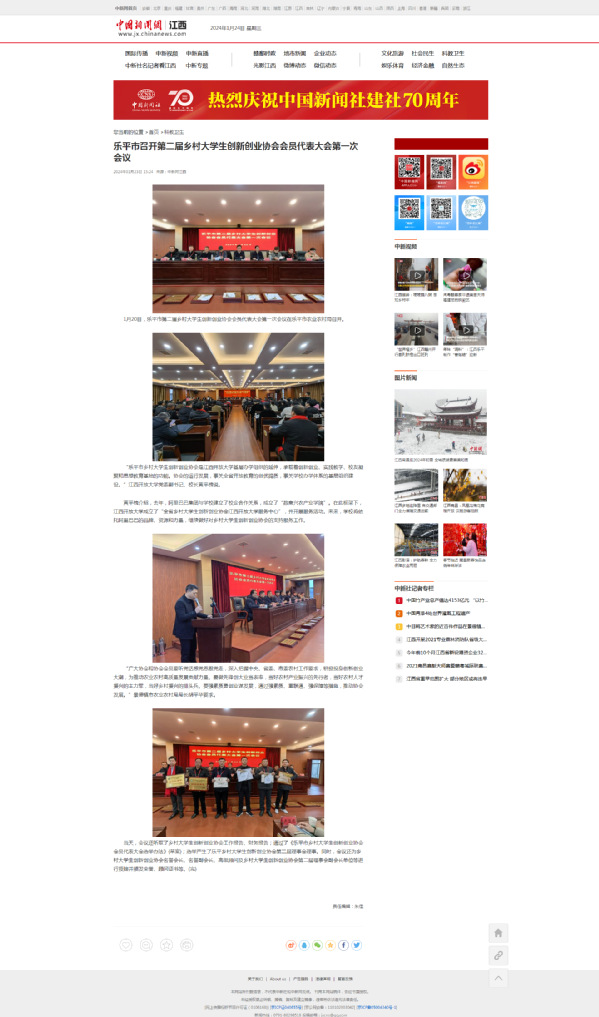 1月20日上午,乐平市乡村大学生创新创业协会举行换届大会,校党委副书记、校长黄平槐受邀出席并致辞。原文地址:http://www.jx.chinanews.com.cn/news/2024/0123/91288.html (责任编辑:罗楚颖)