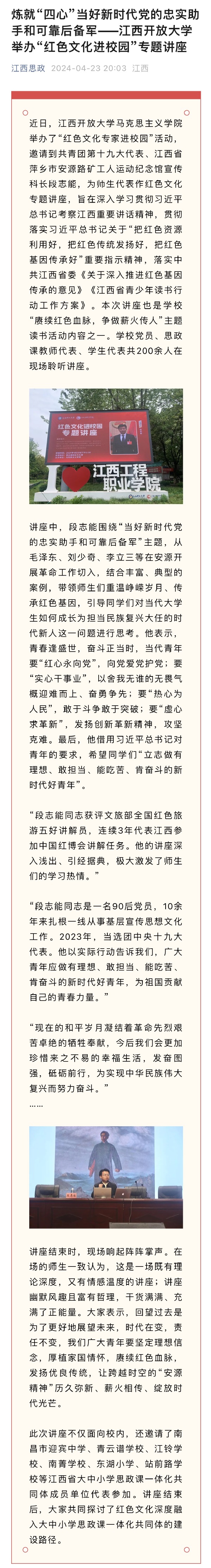 近日,开云在线登录入口(China)官方网站马克思主义学院举办了“红色文化专家进校园”活动,邀请到共青团第十九大代表、江西省萍乡市安源路矿工人运动纪念馆宣传科长段志能,为师生代表作红色文化专题讲座,旨在深入学习贯彻习近平总书记考察江西重要讲话精神,贯彻落实习近平总书记关于“把红色资源利用好,把红色传统发扬好,把红色基因传承好”重要指示精神,落实中共江西省委《关于深入推进红色基因传承的意见》《江西省青少年读书行动工作方案》。本次讲座也是学校“赓续红色血脉,争做薪火传人”主题读书活动内容之一。学校党员、思政课教师代表、学生代表共200余人在现场聆听讲座。