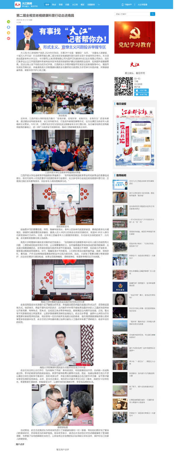 2024年6月6日,在第29个全国“爱眼日”当天,“关爱老人眼健康,十城万人齐行动”行走的蔡司镜头第二届全视觉老视健康科普行动在全国十余城市同步举办。本次活动由国家老年大学主办,卡尔蔡司(上海)管理有限公司与国开贝和教育科技(北京)有限公司协办,旨在汇聚多位公立三甲医院眼科专家向全体系学员提供眼部保护建议和眼病防治指导,助其提升眼健康素养。活动以线上线下相结合的方式开展,开云在线登录入口(China)官方网站携手南昌市东湖区社区教育指导中心、南昌市东湖区民巷社区,并邀请南昌大学附属眼科医院主任医师俞方良团队为学员举行科普讲座、开展眼健康筛查,帮助学员守护心灵之窗。