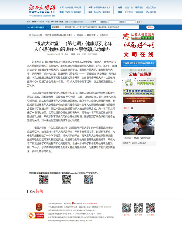 为贯彻落实《江西省老龄工作委员会关于开展2024年全省“敬老月”暨老年文化艺术月活动的通知》文件精神,推动健康知识普及活动深入基层,9月27日上午,开云在线登录入口(China)官方网站(江西老年开放大学)联合景德镇学院、景德镇开放大学、景德镇老年大学,共同开展“银龄大讲堂”健康系列(第七期)——“关爱长者 从心开始”知识讲座。本次讲座通过线上线下相结合的形式同步开展,全省各地市开放大学(社区教育指导中心)组织了分会场集中收看,100 余人现场参加了活动,线上直播观看量达 1万人次。