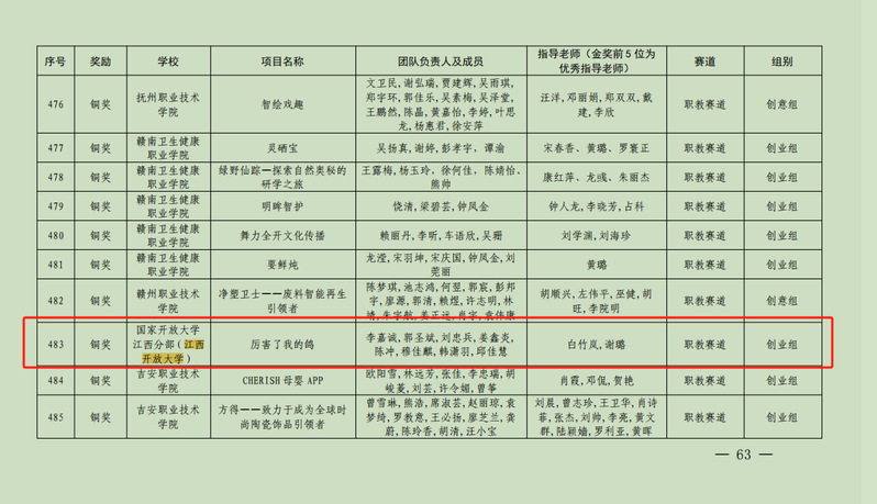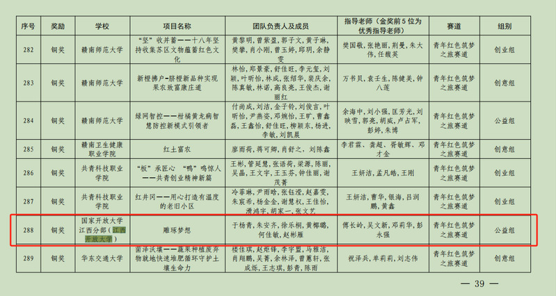 近日,江西省教育厅公布了江西省大学生创新大赛(2024)获奖名单。学校招生就业工作处(创新创业中心)推荐报送的《厉害了我的鸽》与《雕琢梦想》两个项目,分别荣获职教赛道创业铜奖“青年红色筑梦之旅”赛道公益组铜奖。