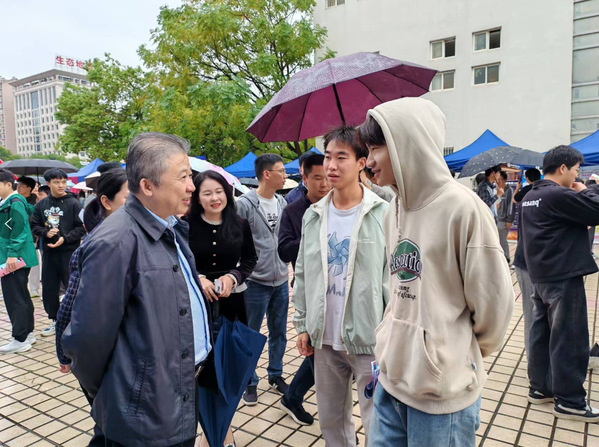 招聘会现场,徐光兵深入学生之中,勉励同学们树立新时代大就业观,积极投身社会实践,不断提升自己的求职能力和综合素质,进一步增强就业的主动性,做能吃苦、肯奋斗的时代新人,为社会进步和发展作出自己的贡献。徐光兵还与用人单位深入交流,详细了解招聘单位的人才需求和薪资待遇,认真听取用人单位对学校人才培养、专业建设等方面的意见建议,并对用人单位来校招聘表示感谢。