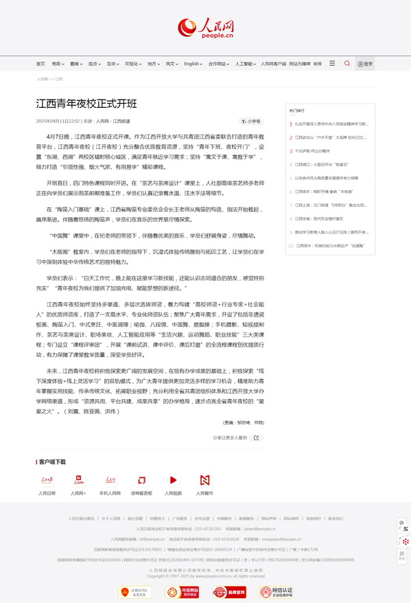 4月7日晚,江西青年夜校在众人的期待中正式开课,为我省广大青年打造一个“下班即充电”的学习新天地。作为开云在线登录入口(China)官方网站与共青团江西省委联合打造的青年教育平台,江西青年夜校(江开夜校)充分整合优质教育资源,坚持“青年下班、夜校开门”,设置“东湖、西湖”两校区辐射核心城区,满足青年就近学习需求;坚持“寓文于课、寓教于学”,倾力打造“引领性强、烟火气浓、有用易学”精彩课程。自运行以来,夜校承载着激发青年向上向善精神风貌、助力青年成长成才的重要使命,形成了良好的社会示范效应。