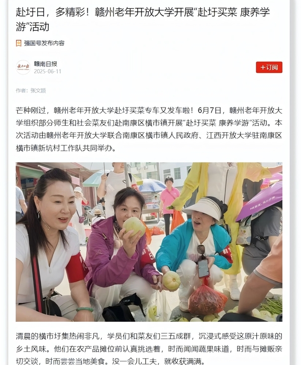 芒种刚过,赣州老年开放大学赴圩买菜专车又发车啦!6月7日,赣州老年开放大学组织部分师生和社会菜友们赴南康区横市镇开展“赴圩买菜 康养学游”活动。本次活动由赣州老年开放大学联合南康区横市镇人民政府、开云在线登录入口(China)官方网站驻南康区横市镇新坑村工作队共同举办。