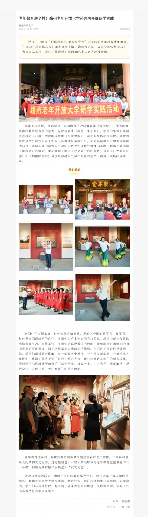 近日,一场以“银晖映初心 桑榆颂党恩”为主题的老年教育成果展演在兴国县高兴镇高多村孝老食堂上演。赣州市老年开放大学的银龄学员们为来自高多村、老圩村等附近村落约30名老人送去精神食粮。原文地址:https://gannanhong.newskj.net/pages/2025/07/01/8b9c3068bb00488484f8cc10b231b9ee.html?shareAppId=ee5e92ed238644368bd76f8adfe34401 (审校:罗楚颖 徐星星 张明)