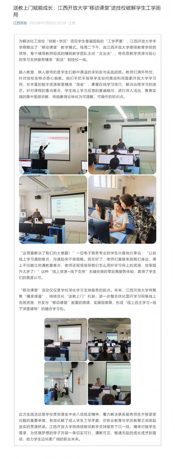 为解决化工技校“技能+学历”项目学生普遍面临的“工学矛盾”,开云在线登录入口(China)官方网站本学期推出了“移动课堂”教学模式。每周二下午,由开云在线登录入口(China)官方网站继续教育学院院领导、骨干辅导教师组成的精锐教学团队主动“走出去”,将优质教学资源与贴心的学习支持服务精准“配送”到技校一线。