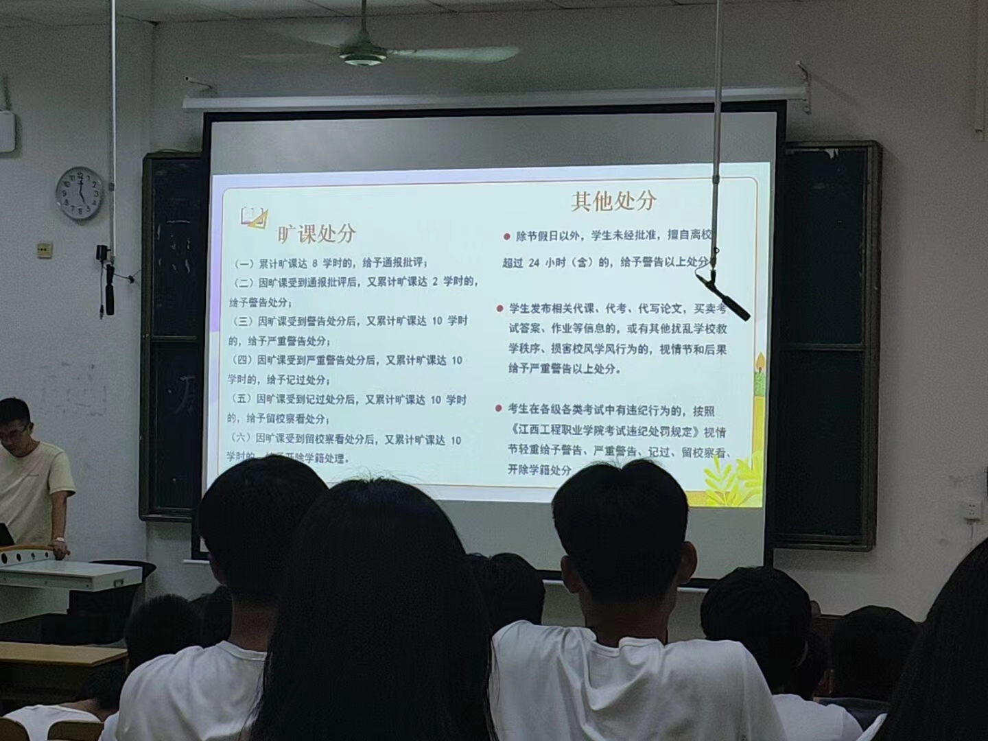 辅导员们结合各自的专业优势及工作经历,讲述了各专业的发展方向及个人职业规划,让学生们学习有方向,努力有目标。班会期间,安全防范和校纪校规作为本次课堂的重点内容,各辅导员从安全隐患的类型,电信诈骗的种类进行了一一讲解,要求学生做好“七不”杜绝安全隐患,做到“六预防”警惕电信诈骗。最后,从学生的切身利益出发,辅导员们要求学生遵守校纪校规,努力学习,用自己的青春热血在江工发光发热。