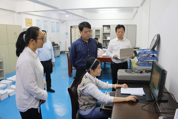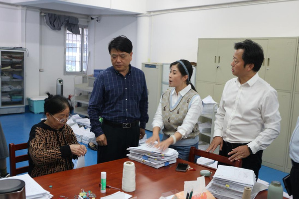 贺瑞虎仔细查看了学校档案查询室、档案库房、馆藏档案等情况,详细了解档案资料的接收、分类、编号、整理、查阅、利用、保存、安全、保密等方面工作,就馆藏资料数字化等相关问题和档案科工作人员进行了现场交流。校档案工作人员汇报了近期档案数字化工作进展情况。