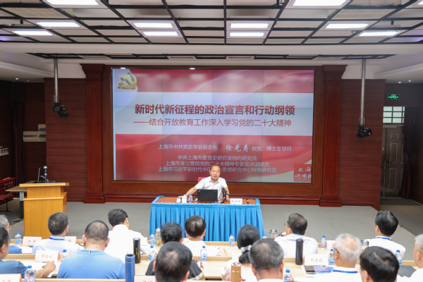 开班式后,上海市中共党史学会副会长徐光寿教授为培训班讲授第一讲。他以《新时代新征程的政治宣言和行动纲领——结合开放教育工作深入学习党的二十大精神》为题,为培训班学员深入解析了党的二十大精神的重要特点、核心要点和根本保证,并立足党的二十大报告中关于教育的重要内容,结合开放大学发展实际,对学校改革发展提出了意见建议。