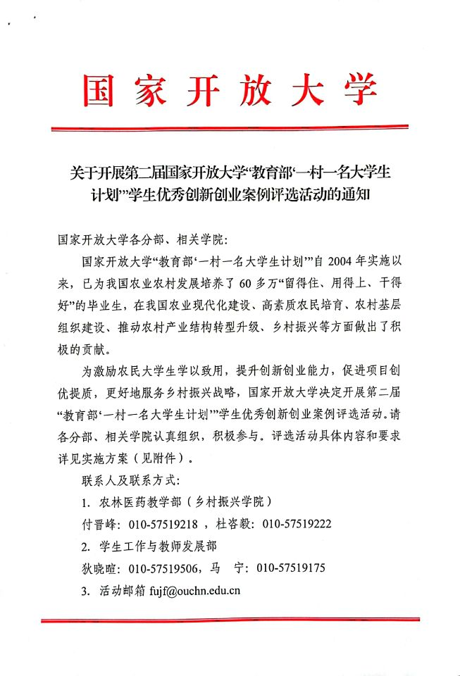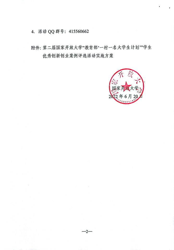 附:1.第二届国家开放大学“教育部‘一村一名大学生计划’”学生优秀创新创业案例评选活动报名表