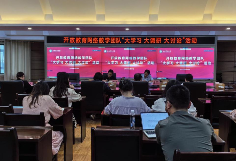 为扎实推进学校开放教育网络教学团队建设,促进团队成员之间的交流与合作,近期,教务处组织开展开放教育网络课程教学团队“大学习、大调研、大讨论”活动。6月1日-15日,教务处联合教学质量评估中心、各专业学院对南昌、上饶、赣州、萍乡四所市级开放大学和部分县级开放学院开展学情及“全省开大一堂课”大调研。6月20日,教务处以线上线下相结合的方式组织开展“大学习、大讨论”活动,60余名网络课程团队负责人参加。活动由教务处副处长曾九江主持。