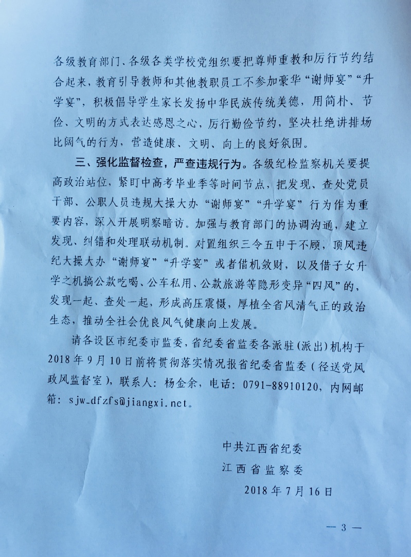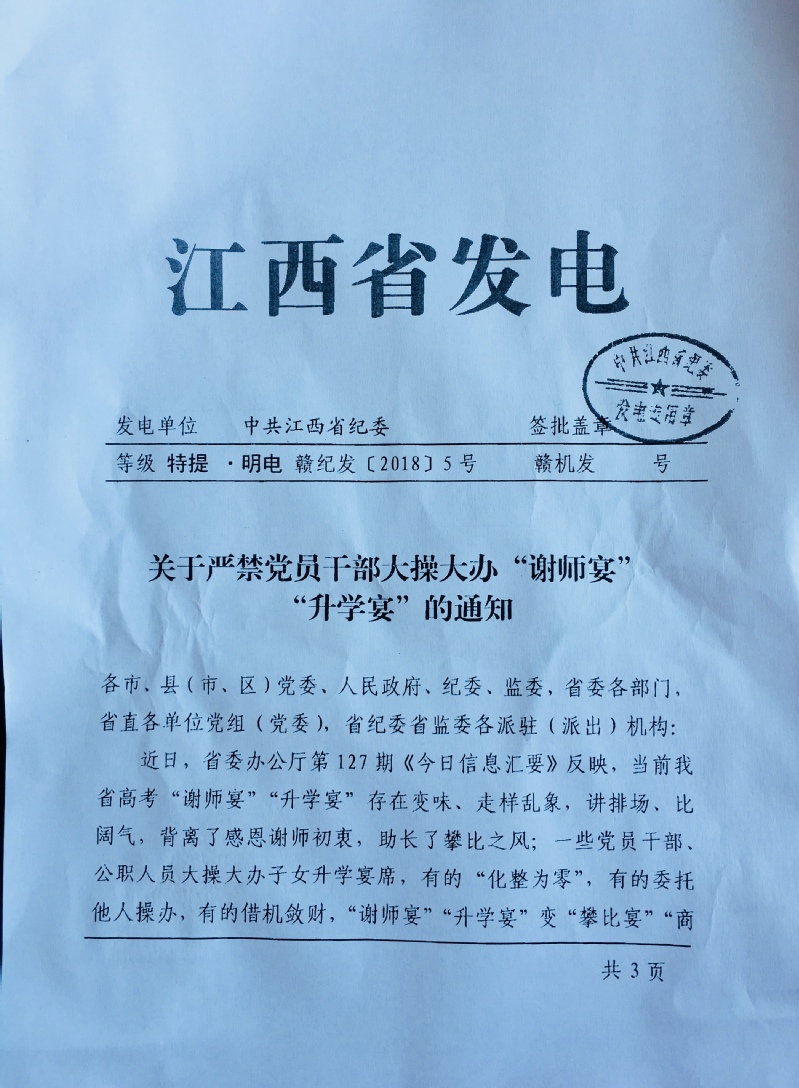 关于转发省纪委关于严禁党员干部大操大办“谢师宴”“升学宴”的通知的通知校内各基层党委(党总支)、各部门(单位):近日,省纪委下发了《关于严禁党员干部大操大办“谢师宴”“升学宴”的通知》(赣纪发﹝2018﹞5号),现转发给你们,请认真贯彻落实。 附件:关于严禁党员干部大操大办“谢师宴”“升学宴”的通知 中共江西广播电视大学纪律检查委员会2018年7月18日