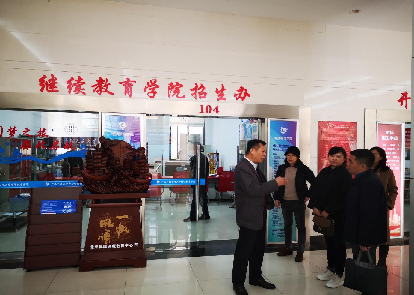 为促进我校继续教育进一步发展,探索继续教育发展新模式、破解成人高等教育目前存在的瓶颈,12月9日,校党委委员、副校长冯豫红,江西省教育厅职成处二级调研员杨春年一行赴广西广播电视大学就成人高等教育“二元制”人才培养模式改革进行专题调研,随行还交流了广西壮族自治区社区教育的发展情况。