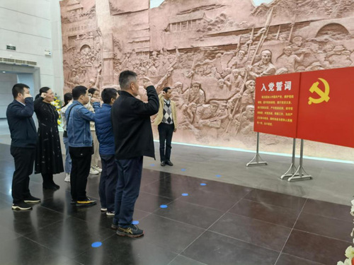 进入纪念堂,在序厅,全体党员干部面对鲜红的中国共产党党旗,党支部书记余歙峰同志带领全体党员同志以坚定有力的声音重温入党誓词,表达“不忘初心、牢记使命”的信念和决心。