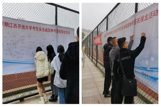 3月4日至5日,2022年秋季学期开放教育期末纸质考试进行。开考前,继续教育学院在西湖校区考点组织近千名开放教育考生进行安全诚信参考签名接龙活动。活动现场,同学们在条幅上认真签下自己的姓名,表达了自己安全诚信考试的决心。大家纷纷表示会严格遵守考试纪律和考场秩序,积极践行安全诚信考试承诺。学生签名现场本次签名活动的开展,不仅有效地督促了学生在期末考试中安全诚信考试,也进一步营造了安全诚信考试的良好氛围。