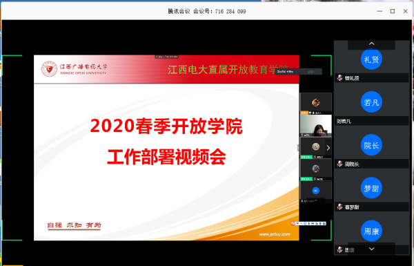 学院院长周终东最后强调了五点,一是大家要适应线上工作和视频会议,做到“简约而透彻”;二是招生要规范,特别是异地生要符合招生要求;三是做好服务工作,积极引导学生网上学习,帮助学生完成学业;四是考试工作严格按上级要求进行;五是加强学院与学生、教师、各教学点的沟通,大家同心协力,在打赢疫情防控战的同时顺利完成本学期各项工作任务!