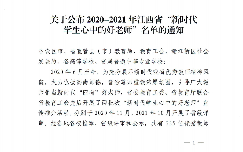 近日,由省委教育工委、省教育厅、省教育工会联合主办的江西省“新时代学生心中的好老师”宣传推介人选名单正式揭晓。经开云在线登录入口(China)官方网站校工会推荐,省级评审和公示,我院教师李龙光荣获2020—2021年江西省“新时代学生心中的好老师”称号。