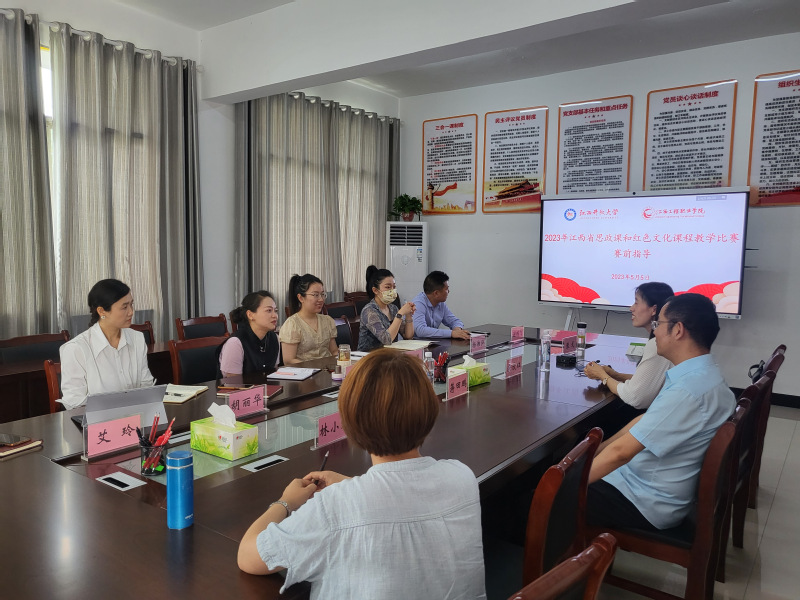 为积极备战2023年江西省思政课和红色文化课程教学比赛,提高我校思政课教师的教学竞赛能力,近日,马克思主义学院邀请南昌大学马克思主义学院副院长蒋田鹏、江西工业贸易职业技术学院涂欣红老师作辅导讲座。马克思主义学院全体思政课教师参加。