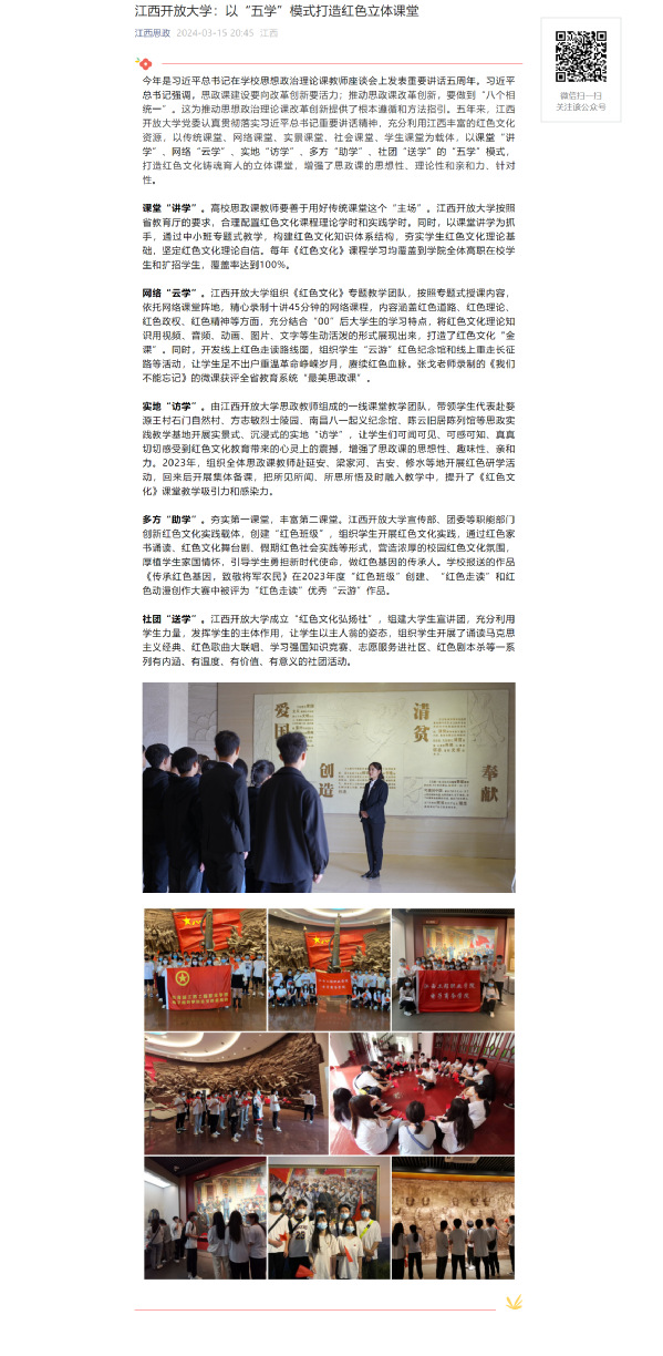 今年是习近平总书记在学校思想政治理论课教师座谈会上发表重要讲话五周年。习近平总书记强调,思政课建设要向改革创新要活力;推动思政课改革创新,要做到“八个相统一”。这为推动思想政治理论课改革创新提供了根本遵循和方法指引。五年来,开云在线登录入口(China)官方网站党委认真贯彻落实习近平总书记重要讲话精神,充分利用江西丰富的红色文化资源,以传统课堂、网络课堂、实景课堂、社会课堂、学生课堂为载体,以课堂“讲学”、网络“云学”、实地“访学”、多方“助学”、社团“送学”的“五学”模式,打造红色文化铸魂育人的立体课堂,增强了思政课的思想性、理论性和亲和力、针对性。