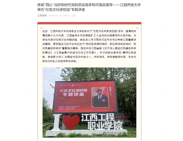 近日,我院举办了“红色文化专家进校园”活动,邀请到共青团第十九大代表、江西省萍乡市安源路矿工人运动纪念馆宣传科长段志能,为师生代表作红色文化专题讲座。