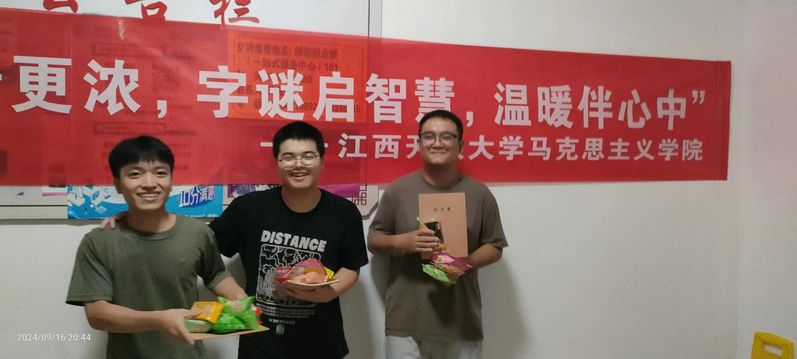 “中秋佳节共欢庆,团聚马院情更浓”。在龙年中秋佳节来临之际,马克思主义学院举办中秋猜字谜活动,让假期留校学生感受到节日的喜庆和学校的关心关爱。学院领导杨峰、喻亮赴宿舍走访看望学生并指导活动开展,代表学院向同学们送去真挚祝福和节日问候。辅导员许鹏、刘兰辉和凌美老师与同学们并肩作战,解谜寻趣。