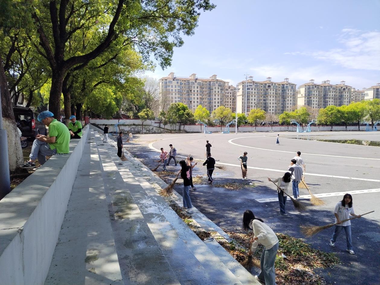 大家挽起袖子,拿起扫帚,将散落在地面上的树叶尽数扫进垃圾车中。学生志愿者们不放过任何一处角落,在操场、图书馆门口、篮球场里,校园内涌动着他们忙碌的身影。