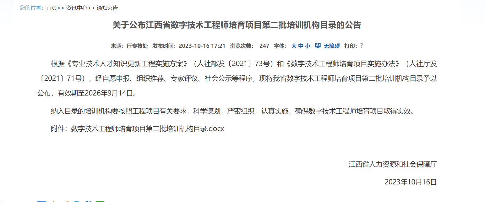 近日,江西省人力资源和社会保障厅公布了江西省数字技术工程师培育项目第二批培训机构目录,我校社会教育学院联合智能技术学院申报的人工智能工程技术人员培育项目培训机构成功获评。