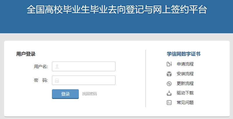 辅导员用户通过 PC端进入登记平台(wq.ncss.cn),选择“学校登录”,使用全国高校毕业生就业管理系统(以下简称“就业管理系统”)账号登录,辅导员就业管理系统登记的手机号码会收到学信网短信,短信中有账号与密码。