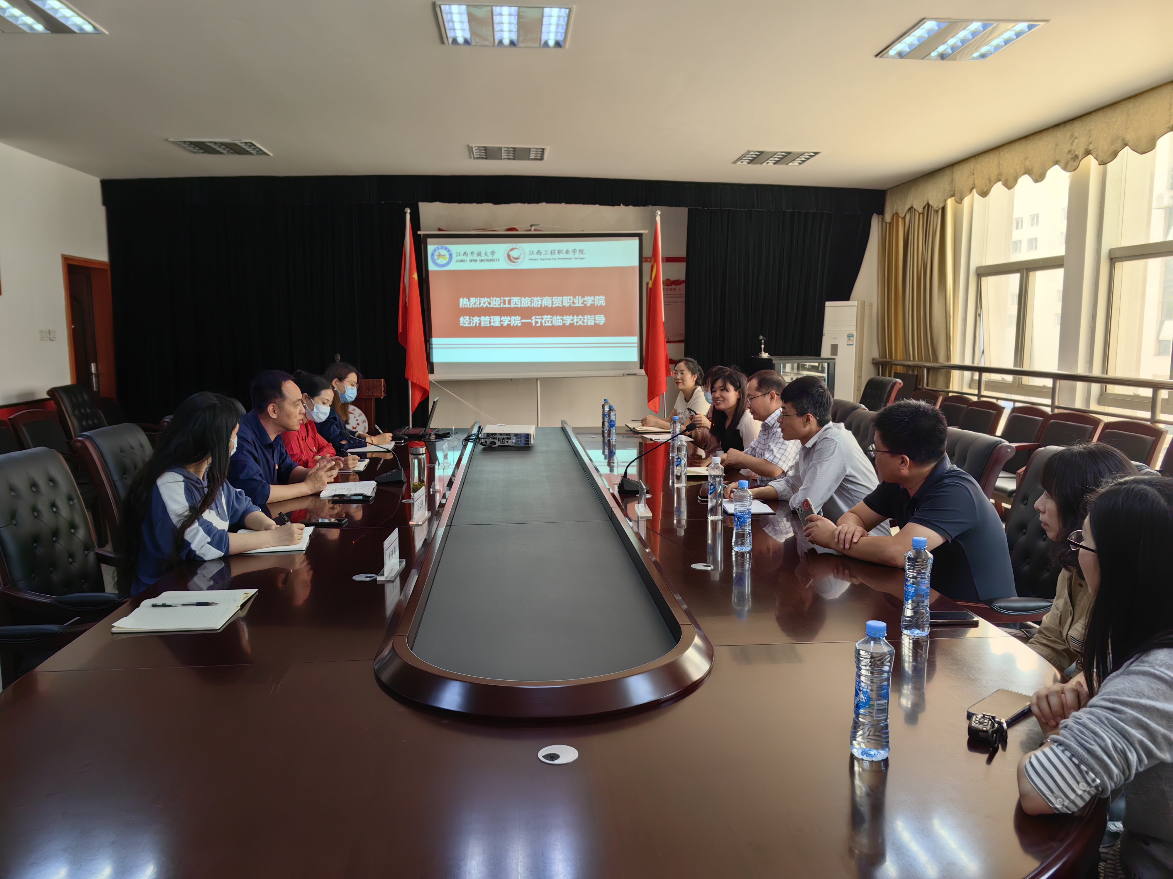 祝维亮代表学院对江西旅游商贸职业学院经济管理学院一行表示热烈欢迎,并详细介绍了我院人才培养特色以及电子商务专业高水平专业群建设情况。黄黎老师代表江西旅游商贸职业学院经济管理学院对我院的热情接待表示感谢,并对我院电子商务专业群取得的系列办学成果表示祝贺,表示未来双方要就专业群建设建立常态化交流机制,进一步推动专业发展。
