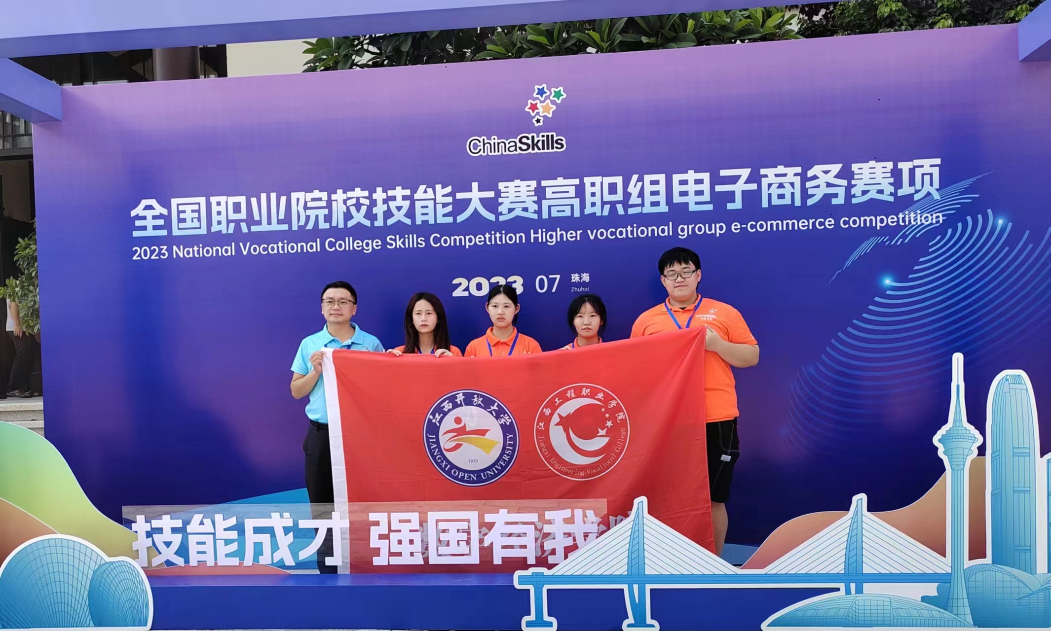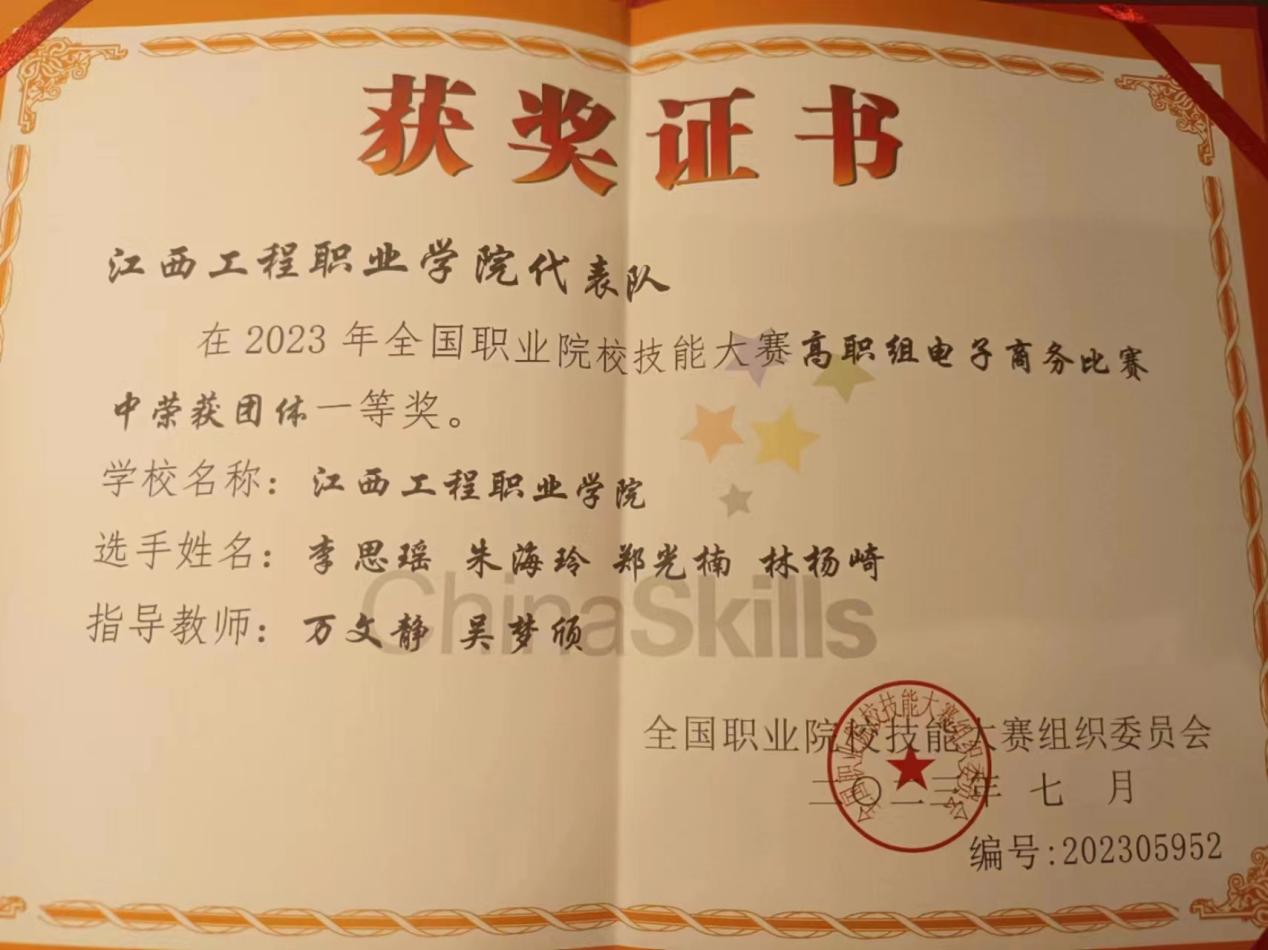7月24-26日,2023年全国职业院校技能大赛(高职组)电子商务赛项在广东科学技术职业学院举办,我校电子商务专业团队代表江西省参赛,经过2天的激烈角逐,由数字经济学院教师万文静、吴梦颀、21电商1班李思瑶、21电商2班朱海玲、21电商3班郑光楠、21市场营销班林杨琦组成的代表队以全国第三名的总成绩,获得国家一等奖!刷新了我校在该项赛项上的最好成绩,实现了国赛金奖零的突破!
