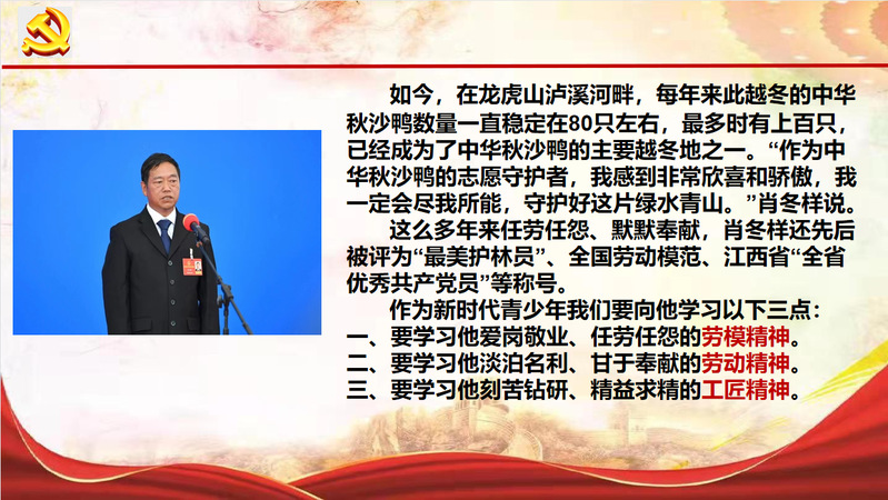 2021级大数据与会计3班的学生刘嘉琪,挖掘到江西省鹰潭市龙虎山风景名胜区上清镇护林员、中华秋沙鸭保护员肖冬样。18年来他扎根深山,主动担起保护动物中华秋沙鸭的重任,详细记录中华秋沙鸭的来去时间、数量以及活动规律和生活习性,拍摄了20多万张照片、1万多G视频,形成了研究中华秋沙鸭的第一手珍贵资料,被称为中华秋沙鸭的“保护神”。他用自己的实际行动,践行一个基层共产党员的职责,在平凡的岗位上做出了不平凡的事迹。