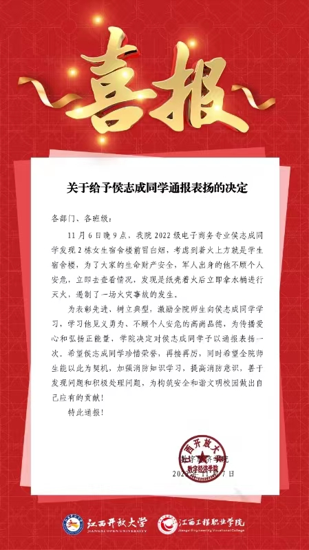为激励全院师生向侯志成同学学习,学习他见义勇为、不顾个人安危的高尚品德,数字经济学院对侯志成同学予以通报表扬。希望全院师生能以此为契机,加强消防知识学习,提高消防意识,善于发现问题和积极处理问题,为构筑安全和谐文明校园做出自己应有的贡献!(供稿:团学科 编辑:王紫莹 责编:涂芳)