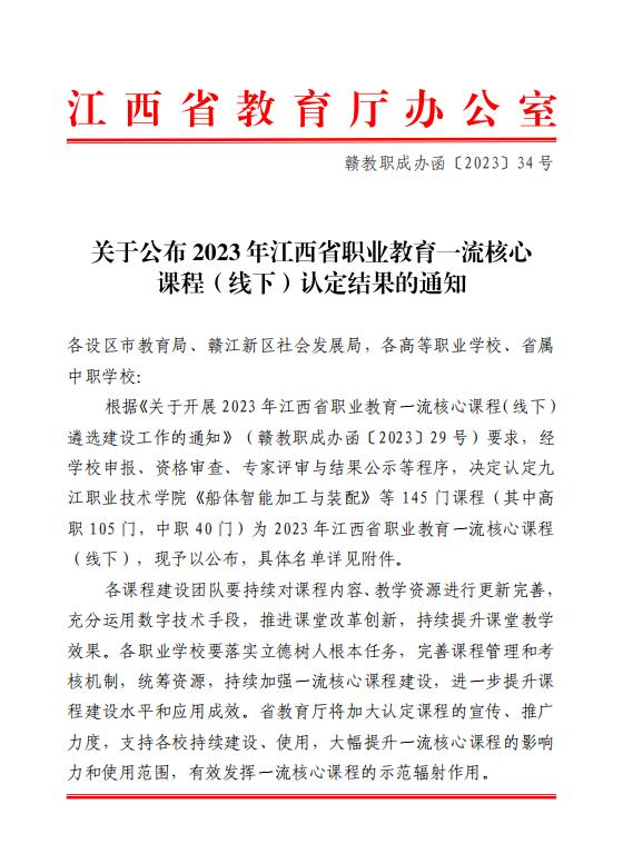近日,由江西省教育厅印发《关于公布2023年江西省职业教育一流核心课程(线下)认定结果的通知》(赣教职成办函〔2023〕34号),我院祝维亮教授课程团队的《商务沟通与谈判》课程被认定为2023年江西省职业教育一流核心课程(线下)。