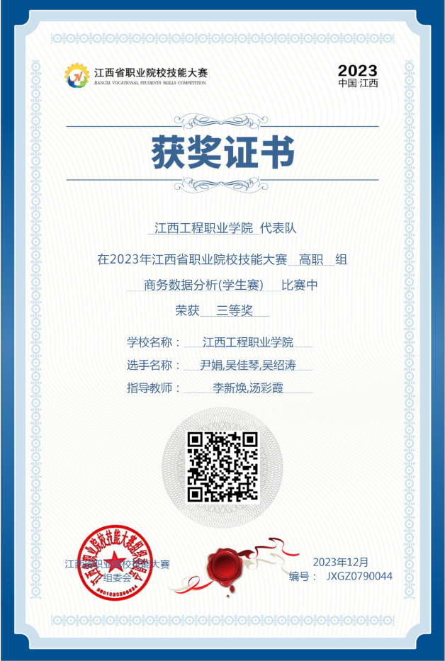 12月24日,2023年江西省职业院校技能大赛(高职组)“商务数据分析”赛项在景德镇陶瓷工艺美术职业技术学院举行。经过长达一天的紧张角逐,由我校数字经济学院教师李新焕、汤彩霞指导,尹娟、吴佳琴、吴绍涛三位同学组成的参赛队伍,首次参赛并荣获江西省职业院校技能大赛“商务数据分析”赛项三等奖。