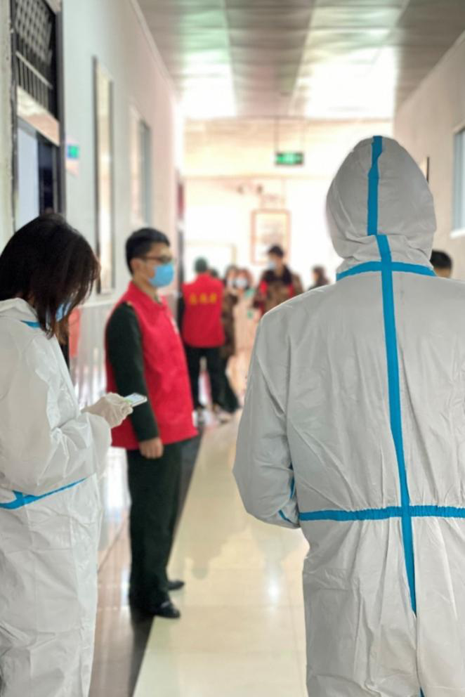 人武系教学干事周琼华说:“我是党员,必须上。我时刻铭记共产党员的初心和使命,能为学院尽一些绵薄之力,发挥党员先锋模范作用,让党徽在战“疫”之中熠熠生辉。”24日早上6点,克服家庭的困难和身体的不适,周老师早早地来到了校园,又开始了第四轮核酸信息采集的服务保障工作。