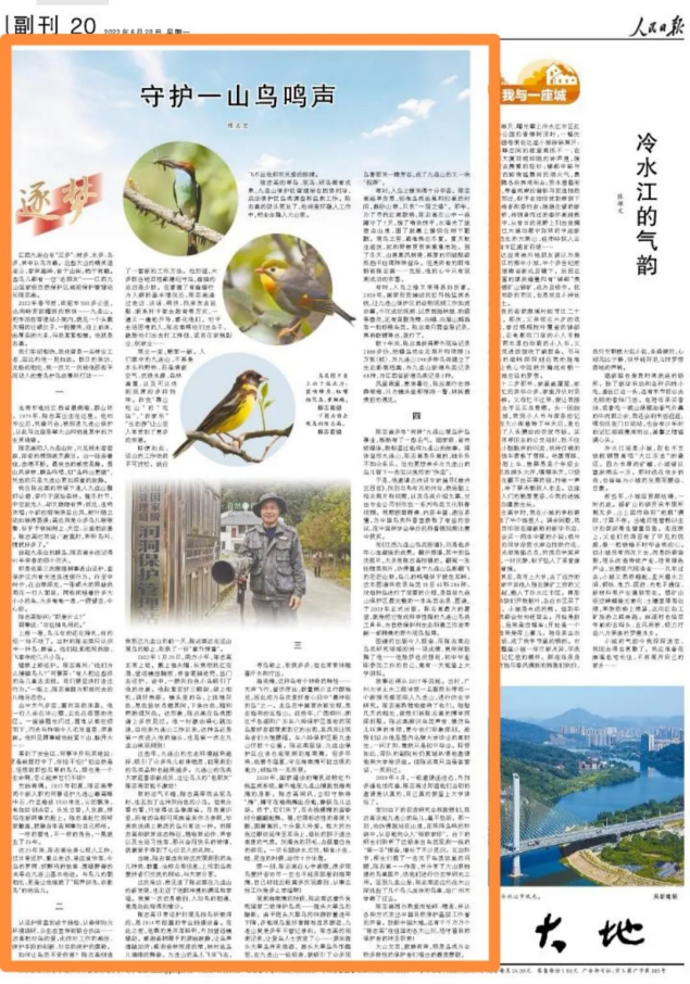 6月20日,我校教师陈志宏的报告文学作品《守护一山鸟鸣声》在《人民日报》大地副刊发表。该文讲述了江西省自然保护基层工作者陈志高守护九连山鸟类的故事,反映出人与自然和谐共生的美好图景,生动诠释了习近平生态文明思想,用活生生的实践印证了“绿水青山就是金山银山”理论的前瞻性和科学性。