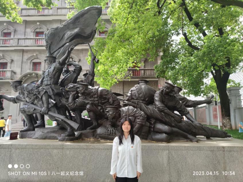 在课余的下午,我来到了南昌建军雕塑广场,它临赣江边而建,船只在江面行驶,几组生动形象的铜雕,让我感觉自己瞬间穿越至战火纷飞的实景中,与他们对话,和他们共同奋战,向他们致敬!——22 电商 1 班 吴婷霞
