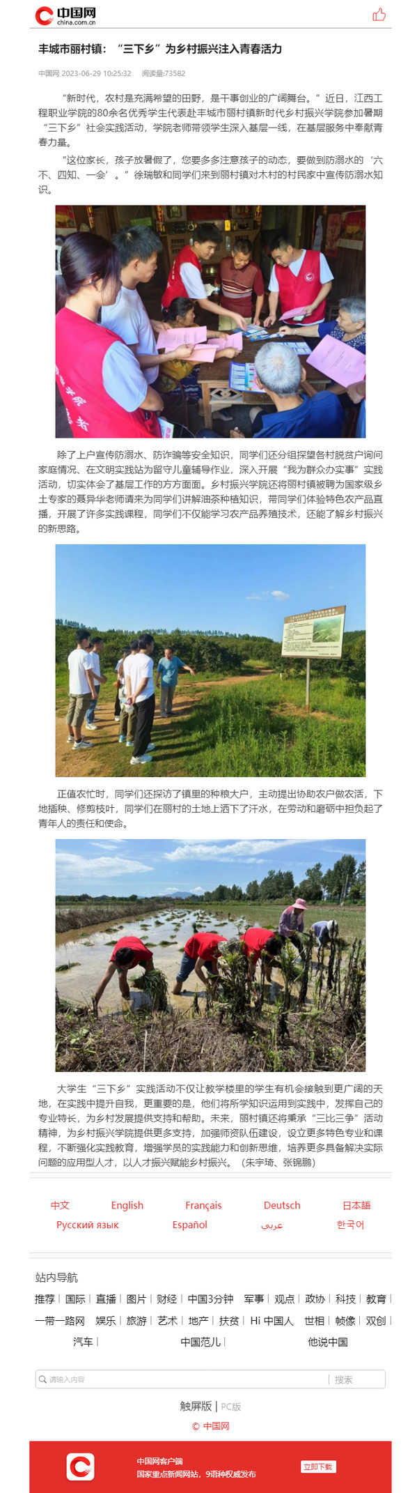 “新时代,农村是充满希望的田野,是干事创业的广阔舞台。”近日,开云在线登录入口(China)官方网站(江西工程职业学院)团委组织80余名优秀学生代表赴丰城市丽村镇新时代乡村振兴学院参加暑期“三下乡”社会实践活动,带领学生深入基层一线,在基层服务中奉献青春力量。6月29日,中国网对此进行报道。