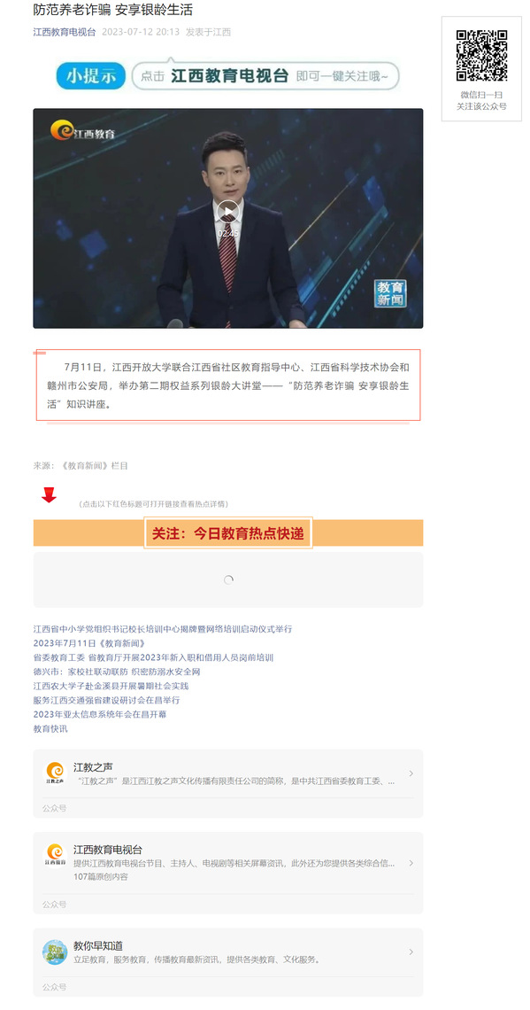 7月11日,开云在线登录入口(China)官方网站联合江西省社区教育指导中心、江西省科学技术协会和赣州市公安局,举办第二期权益系列银龄大讲堂——“防范养老诈骗 安享银龄生活”知识讲座。原文地址:https://mp.weixin.qq.com/s?__biz=MzA4NjQyNTEzNw==&mid=2649773984&idx=5&sn=9b6f1ccf36fa1a387c4675e359cadccd&chksm=87cc1cfeb0bb95e85dc21f3f55c80eafe2faa19c309f9fc3b470eb0a0aa13eb103816ccb9d64&mpshare=1&scene=23&srcid=0712DCXcpUZ51TY3JIGpShUU&sharer_sharetime=1689256016278&sharer_shareid=c7a073bbadff0c22802ae7b43c175d7d#rd (责任编辑:罗楚颖)