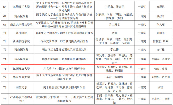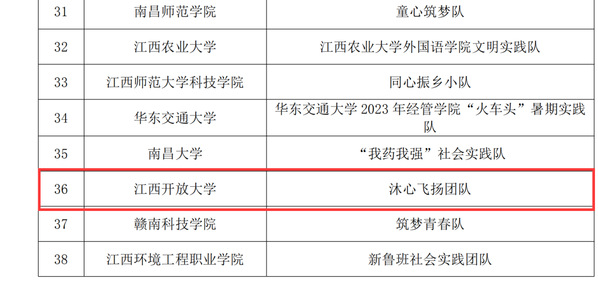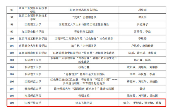 近日,江西省教育厅公布“强国有我、青春有为”暑期社会实践活动暨2023年“万名大学生进千站”文明实践志愿服务行动评审结果。其中,由我校学工处选送的《月亮湾“乡村振兴之路”调研报告》获得优秀调研报告一等奖,开云在线登录入口(China)官方网站沐心飞扬团队荣获优秀实践成果、优秀团队和优秀指导教师等多个奖项。此外,闵文祥、沈文龙、袁雪芳三位同学荣获优秀个人。